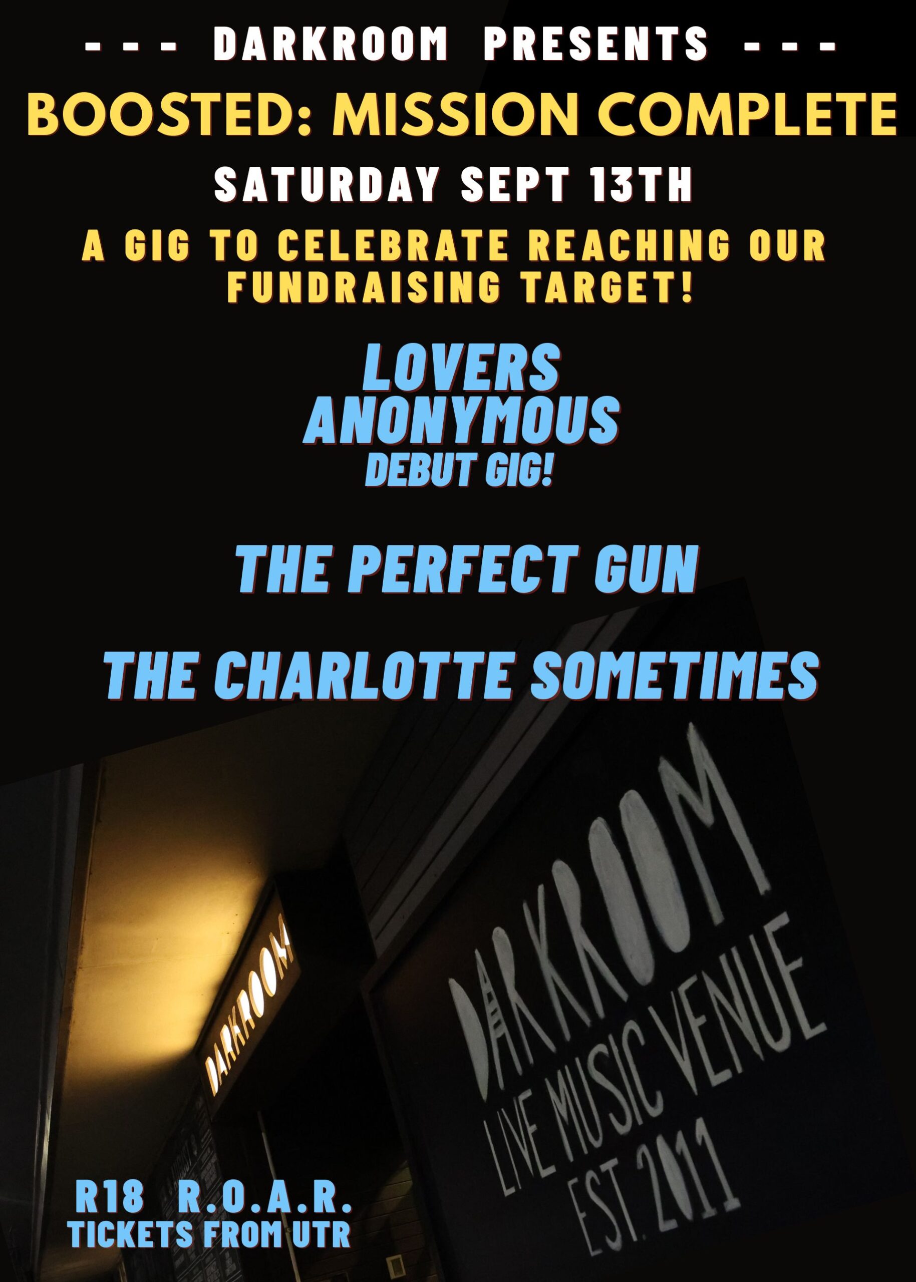 Come on down for a gig on Sat Sept 13th to celebrate the success of Darkroom’s Boosted campaign and check out some live, local music from Lovers Anonymous, The Perfect Gun, and The Charlotte Sometimes!