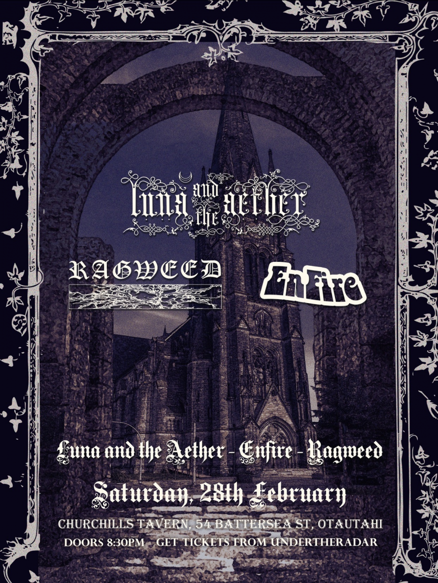 Ōtautahi’s very own gothic alt-rock band ‘Luna And The Aether’ make their debut February 28th at Churchills Tavern, alongside the much awaited return of Stoner doom legends ‘Enfire’ and heavy hitting alt-metal lads from ‘Ragweed’ who are making serious waves in the Chch scene!