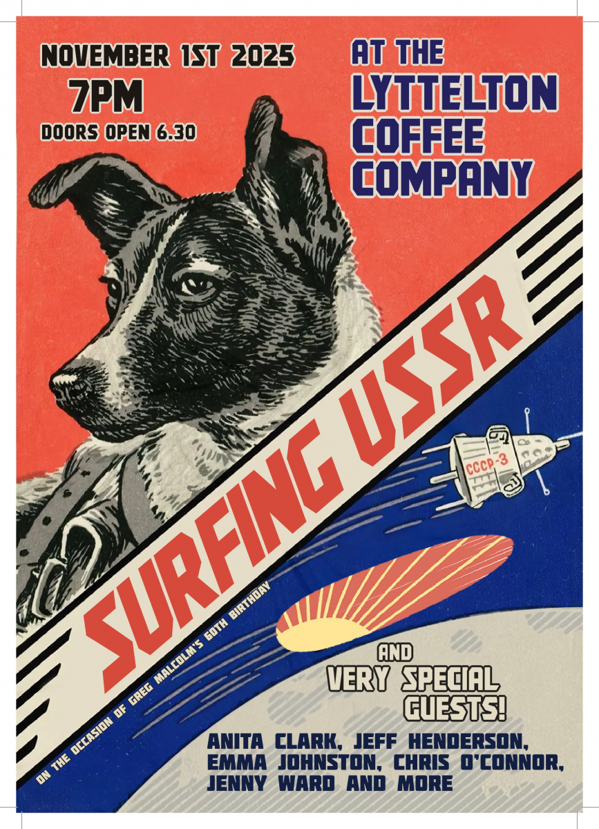At the Lyttelton Coffee Company on November 1, 2025.. Space age exotica, classic surf tunes, music from the Greek hash dens, original space invaders machine for 20 cents a game and more. This event is a significant cosmic anomaly you won’t want to miss.