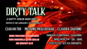 Dirty Talk: A Smutty Spoken Word Soirée is a night of sexy, sensual and seductive poetry and burlesque performances Presented by your hosts Jor Dansaren & Elliot Tremlett And featuring performances from: Ciaran Fox Melanie McKerchar Claudia Jardine Raven Bedlam Mercury Elle Thurs Nov 13th at Darkroom 7pm doors, show starts 7:30pm Tickets from Humanitix […]