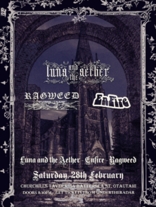 333 - Triple threat all three-piece line up! Ōtautahi’s very own gothic alt-rock band ‘Luna And The Aether’ make their debut February 28th at Churchills Tavern, alongside the much awaited return of Stoner doom legends ‘Enfire’ and heavy hitting alt-metal lads from ‘Ragweed’ who are making serious waves in the Chch scene! Crushing riffs, melodic […]