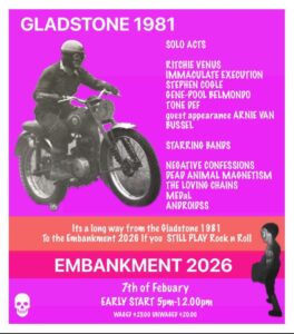 Embankment Tavern 181 Ferry Road Phillipstown on the 7th of Feb (Waitiangi weekend). Starts at 5.30pm and finishes at 12.00pm. Door Sales $25.00 waged $20.00 unwaged, cash or efpos available. The concept of the gig is people who played at the Gladstone in 1981 to people who are still playing music in 2026. There will be original music, some covers, back to 1981 to the future now!! The Andriodss have reformed to do a set.