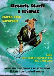 Friday 13th March, 2026 Darkroom, Christchurch Doors open at 8pm Music starts at 8.30pm. Tickets $10 + bf online, $15 at the door. Electric Starfi are usually a duo (Talon Adams and Steffi Brightwell) who set observational poetry to ambient, colourful guitar and bass music. For one night only, their set will be laced with collaborations and cameos from a variety of local musicians and poets. Who? What? You'll have to be there to find that out! The night will…