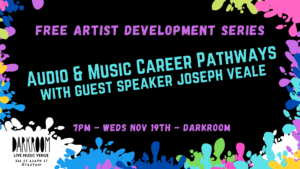 Darkroom's Free Artist Development Series is back and this month's topic is Audio and Music Career Pathways, or more specifically "Weird Career Pathways" Wed Nov 19th at Darkroom, 336 St Asaph St 7pm doors, talk starts 7:30pm This month's guest speaker is Audio Engineer Joseph Veale OH, AND THERE WILL BE FREE SNACKS! You've got the passion for music and audio work, maybe you're studying it, keen to study it, or maybe you've already gone and gotten yourself a qualification…