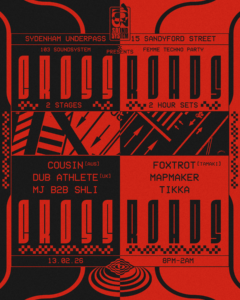103 Soundsystem and Femme Techno Party are proud to present CROSSROADSCrossroads explores the intersections of underground dance music, with contrasting but complementary artists programmed across two stages. Long format sets underpin the flow of the night, enabling artists to explore deeper cutsThis edition we feature Cousin (AU) and Athlete (UK) alongside Foxtrot, Mapmaker, MJ, Shli and Tikka